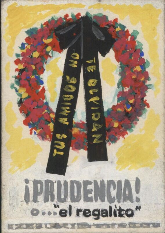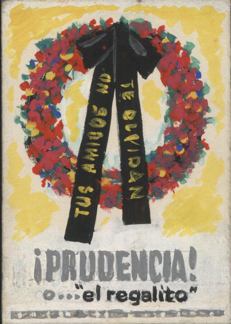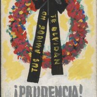 - Bajo el lema de “¡prudencia! O… el regalito” se ha representado, en un fondo amarillo, una corona de flores rojas, verdes y amarillas con un lazo negro en el que se puede leer en letras doradas “tus amigos no te olvidan”.