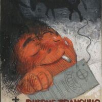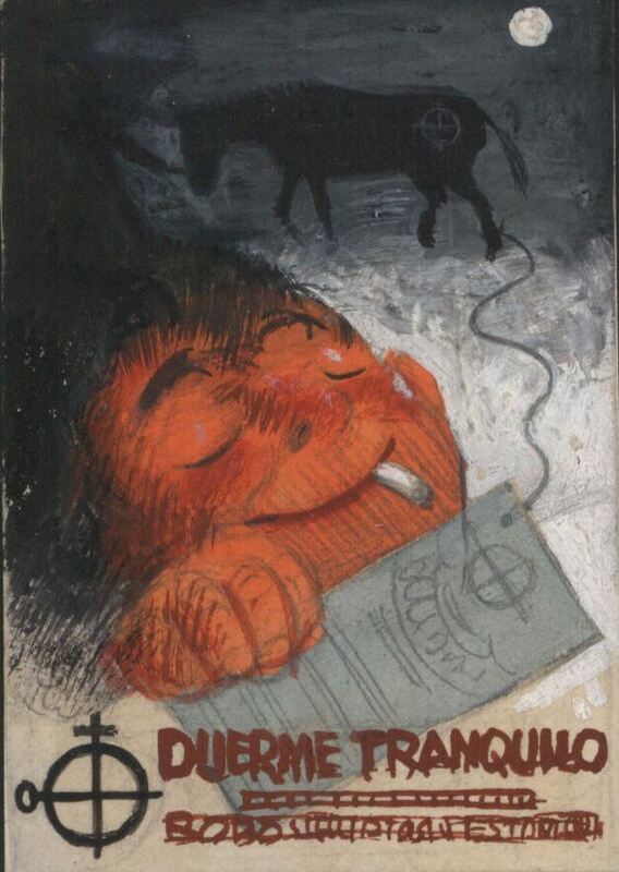 Con el título “duerme tranquilo”, en caracteres rojos, se ha representado la cara de un chico sosteniendo entre sus labios un cigarro y mientras duerme, casi sonriendo, sujeta en su mano un papel gris. En segundo plano, sobre un fondo gris, destaca la imagen de un caballo negro y de perfil. El papel gris se encuentra unido a una pata del caballo por medio de un hilo, también gris.