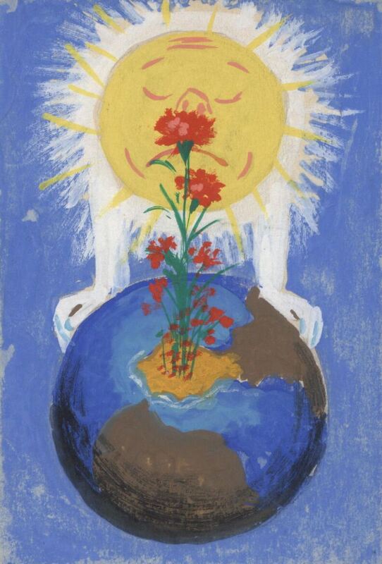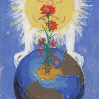 - Sobre un fondo azul destacan tres figuras en este dibujo: el globo terráqueo sobre el cual el sol resplandeciente dibujado con unos brazos y manos se apoya en él para oler una flor roja de gran tallo que crece en tierras de España, como se puede ver en el globo de color amarillo.