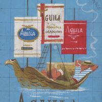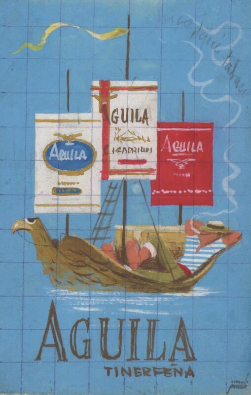 Sobre un fondo azul y en una superficie cuadriculada se ha dibujado en el centro de la composición un barco con forma de águila en el que un marinero descansa tranquilamente. Las velas del barco están formadas por tres paquetes de tabaco, dos blancos y uno rojo. El título, en la parte inferior, se puede leer en letras mayúsculas doradas. Destaca, también en esta parte inferior en la esquina izquierda, la firma del pintor.