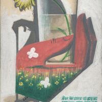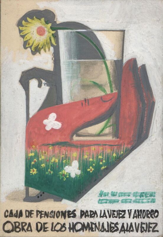 Sobre un fondo blanco se ven cuatro elementos unidos: una mano roja, en cuyo interior se ve un paisaje verde, sostiene un vaso con agua en el que hay una flor amarilla. Por detrás destaca la sombra gris de una anciana de perfil, encorvada y ayudándose por un bastón. Inferiormente está presente el título en letras negras: “caja de pensiones para la vejez y el ahorro. Obra de los homenajes a la vejez”. Por encima, destaca el boceto de una frase en verde de difícil comprensión.