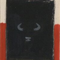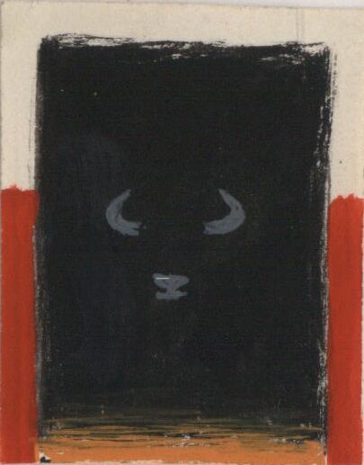 - De un interior negro se vislumbra el hocico y los cuernos grises de un toro que se prepara para salir a la arena de una plaza. El exterior que enmarca la puerta de salida es mitad rojo y mitad gris.