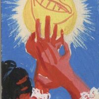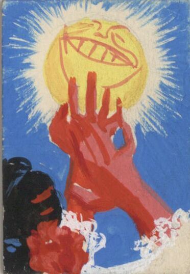 - Una mujer de espalda que surge en el lado derecho de la composición, de la que solamente se ve su pelo negro atado en un moño adornado con un clavel rojo, bate palmas a un sol resplandeciente y sonriente en un cielo azul.