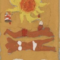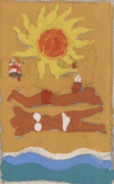- La escena de este dibujo representa una playa de arena amarilla mostaza con las aguas ondulantes del mar azul, verde y con la espuma blanca. Una pareja, la mujer con bikini blanco y el hombre con el traje de baño rojo, toma el sol.