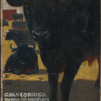 - Cartel de la beneficencia, donde la mayor parte del espacio lo ocupa un toro de frente mirando al espectador, y en la lejanía un toro sentado sobre sus patas y detrás de él otros de pie.