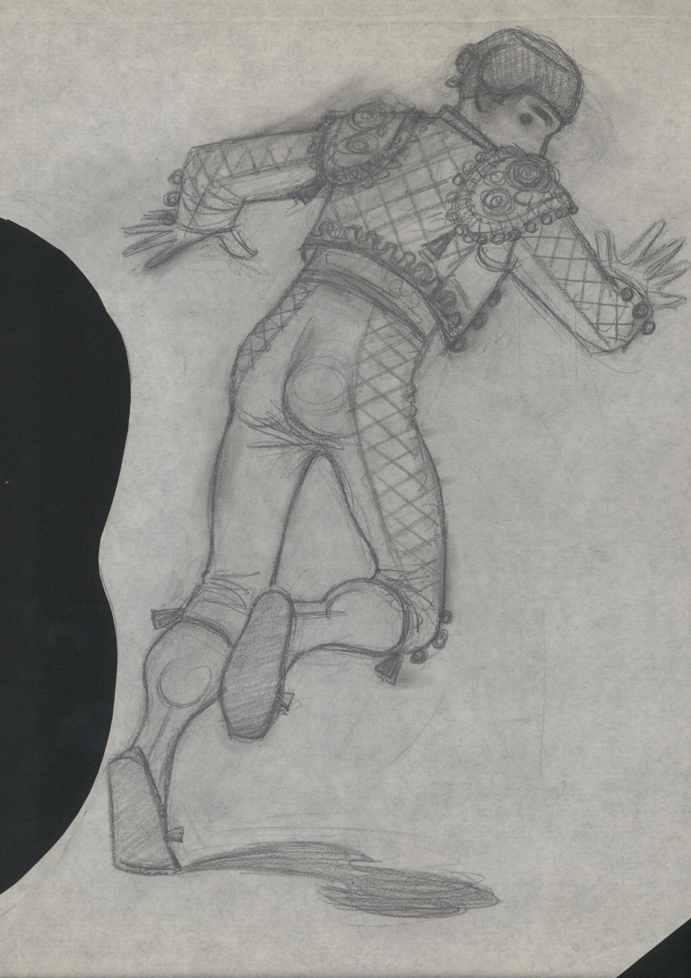 - Imagen de la figura de un torero vestido de luces visto de espaldas, que sale corriendo cuya cabeza gira para ver el peligro mientras corre, en una de los laterales de la escena, se aprecia silueta de la cara de un espectador delimitado por líneas curvas y fundida en negro.