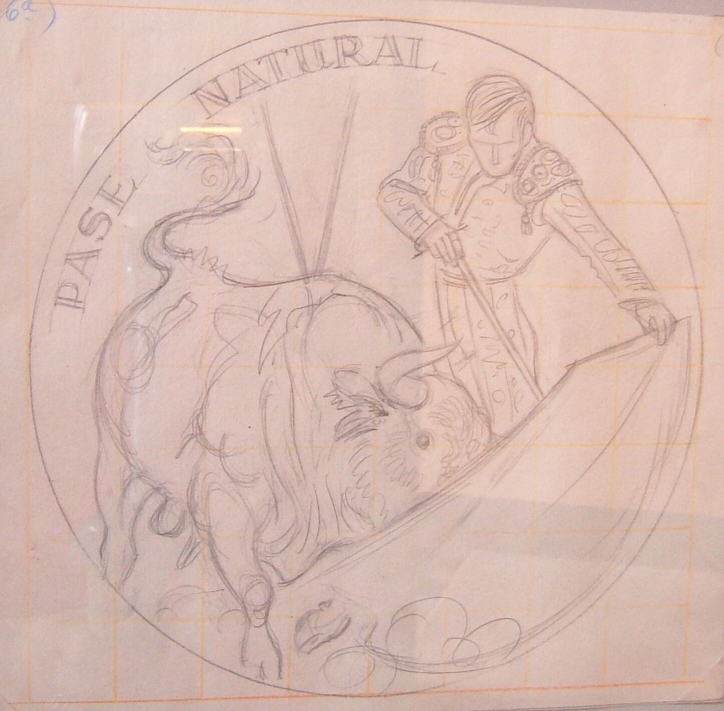 Fotografía de una composición de ocho dibujos, formando una serie de bocetos para un conjunto de medallas representativas con distintos momentos de los personajes que protagonizan la fiesta taurina. Grupo de 8 obras, anverso-reverso, realizadas para Acuñaciones Españolas serie TAUROMAQUIA -titulo: Un par al quiebro, reverso. ME/Esc-neg1586 ME/Galb.1402