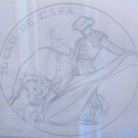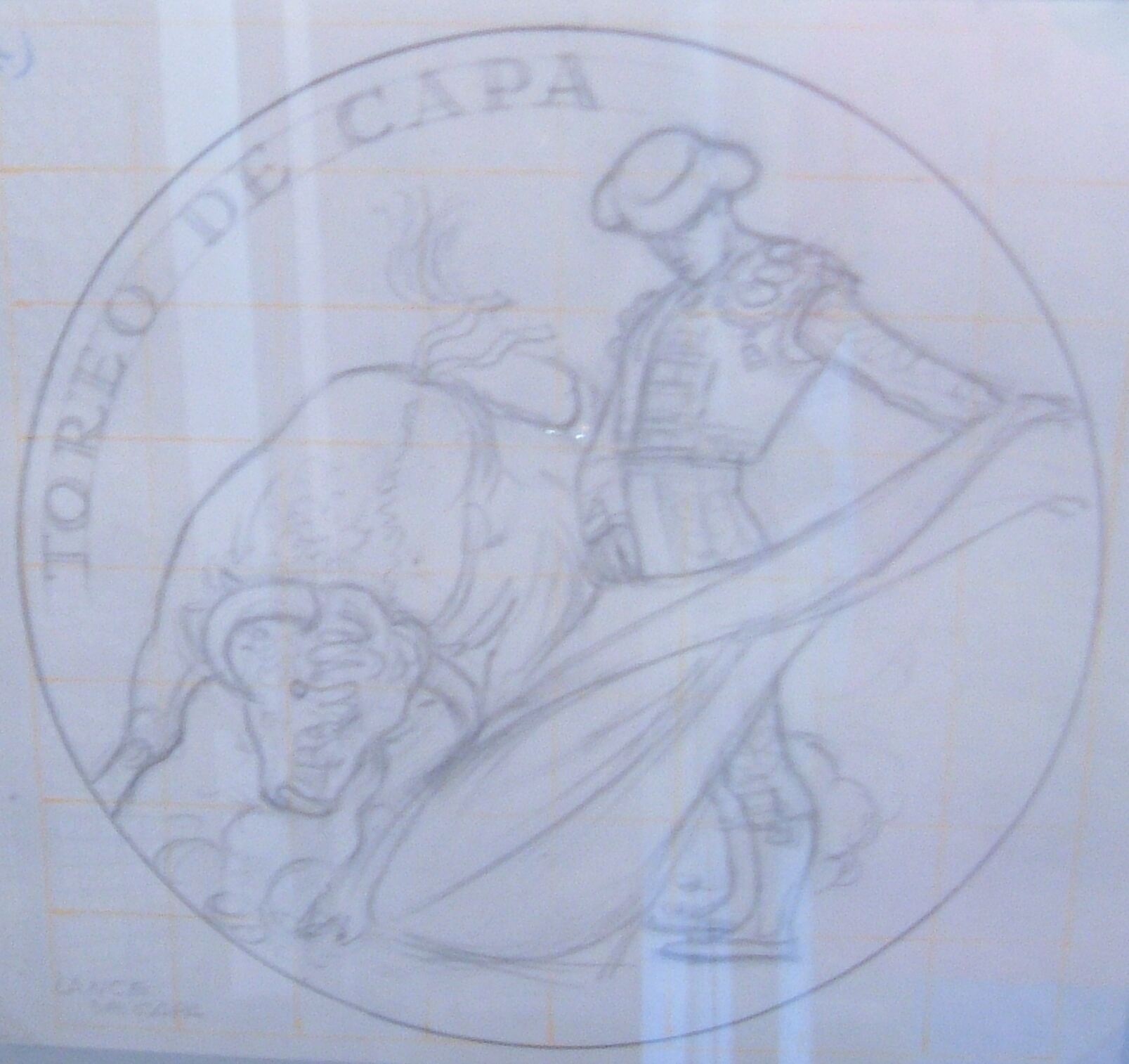 Fotografía de la composición de ocho dibujos que forman una serie de medallas con diferentes momentos de la fiesta: picador, la caída del picador, salida del burladero, la llave, el ruedo, patio de caballos, larga cambiada y toreo de capa. Grupo de 8 obras anverso-reverso, realizadas para Acuñaciones Españolas. Título:SALIDA DEL TORO reverso. Me/esc-neg.1595 ME/Galb1405