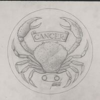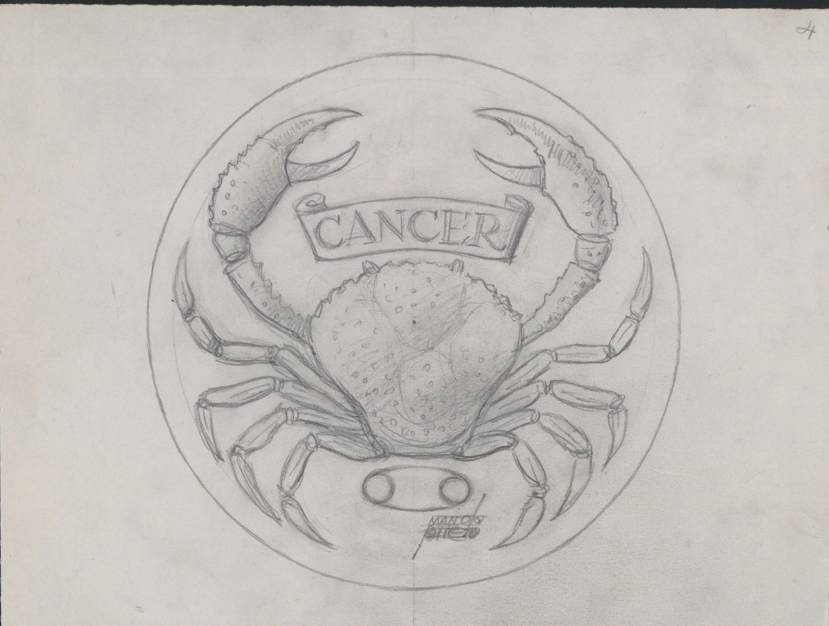 Boceto a lápiz del anverso de la medalla que representa el signo del zodiaco Cáncer, con la imagen de un cangrejo de grandes pinzas en los extremos de sus patas delanteras. La composición tiene una enorme fuerza.Dibujo realizado para la medalla encargada por INSTITUTO NUMISMATICO. Titulo CANCER ME/Galb/1410