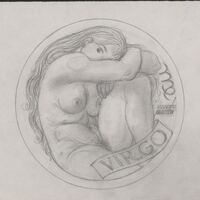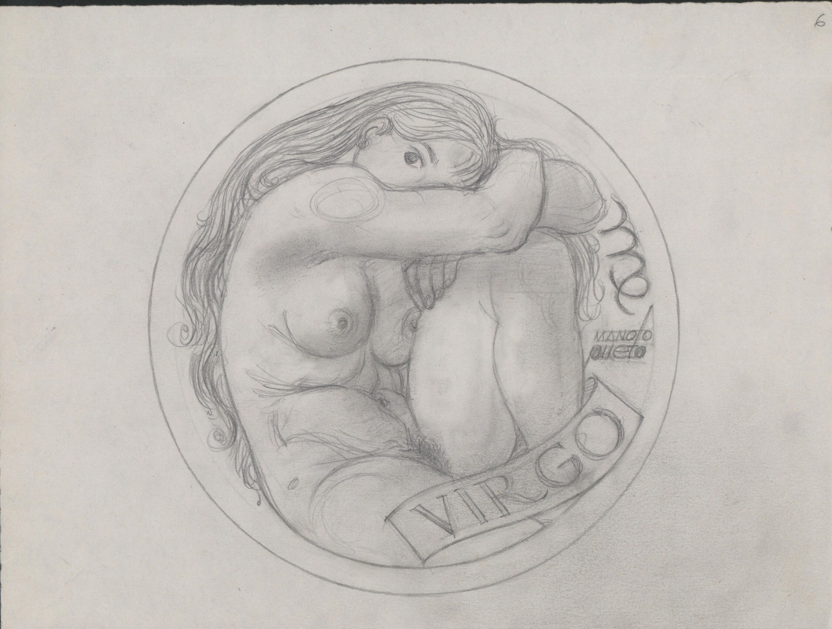 Boceto a lápiz del anverso de la medalla que representa el signo del zodiaco Virgo, con la imagen de una mujer desnuda de gran melena larga que cae sobre su espalda que se apoya sobre sus brazos cruzados sobre una de sus rodillas.Dibujo realizado para la medalla titulo VIRGO (anverso) encargo de INSTITUTO NUMISMATICO. ME/Galb/1412 ME/Esc. NO