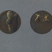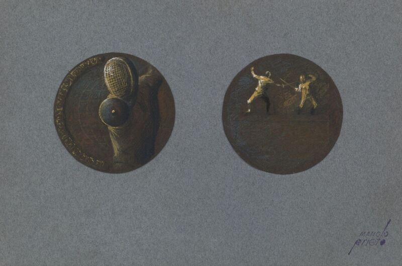 - Medalla en cuyo anverso se aprecia en primer término a un deportista de esgrima con su máscara protectora y el florete que nos apunta directamente a nosotros; y en el reverso la escena de dos esgrimistas en plena lucha.Medalla no realizada, no tenemos referencias