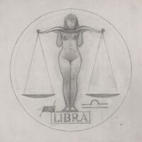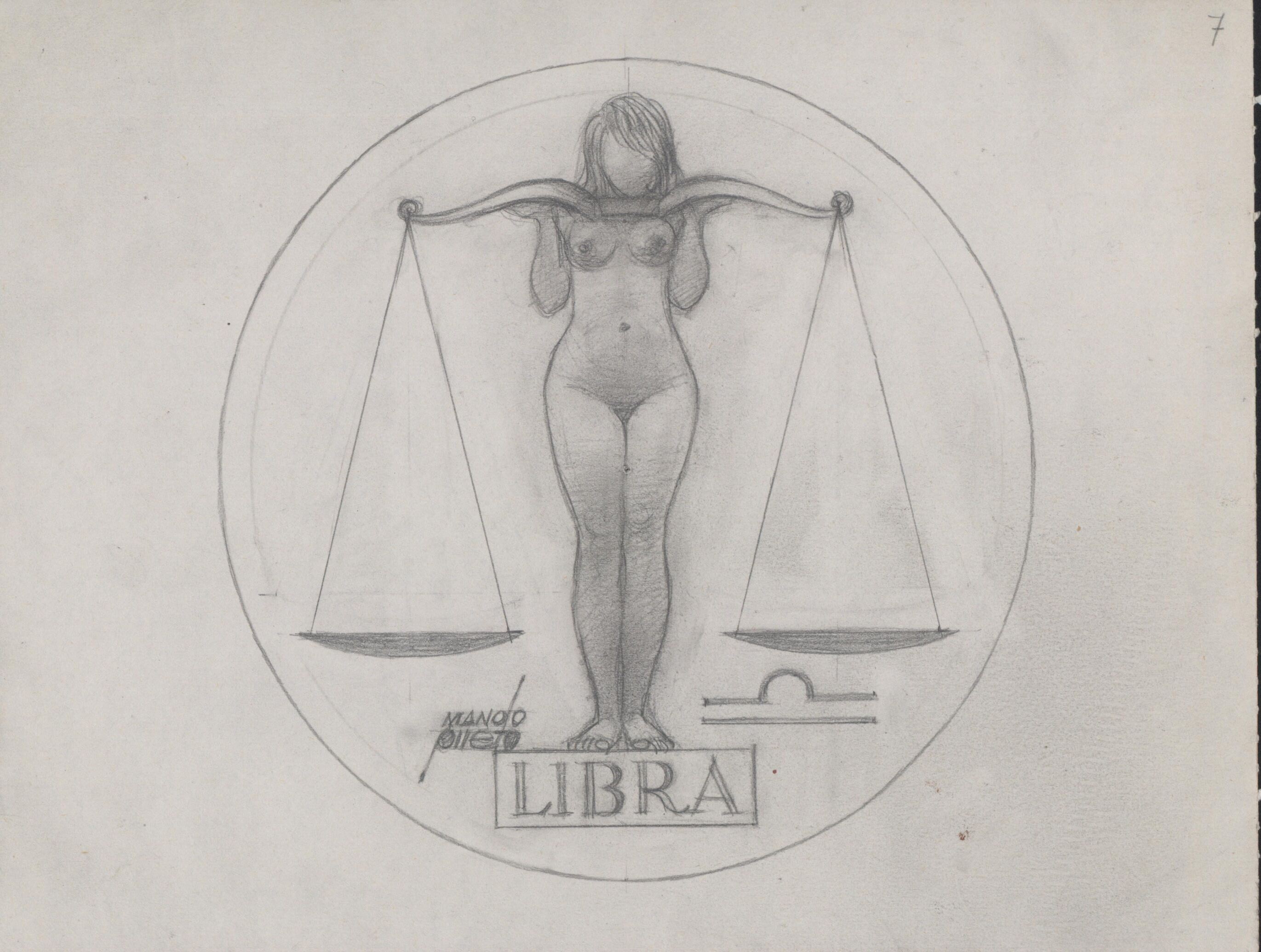 Boceto a lápiz del anverso de la medalla que representa el signo del zodiaco Libra, con la imagen central de una balanza caracterizada con el cuerpo desnudo de una mujer que sujeta con sus manos dicha balanza.Dibujo para realizar la medalla de signos del zodiaco titulo LIBRA encargado por INSTITUTO NUMISMATICOME/Galb/.1414 ME/ otros archivos NO