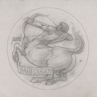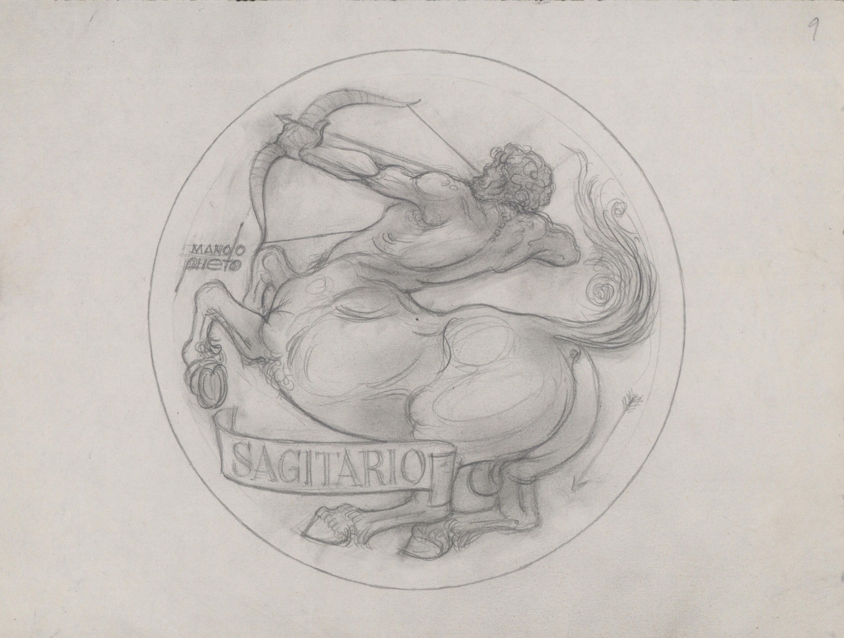 Boceto a lápiz del anverso de la medalla que representa el signo del zodiaco Sagitario, con la imagen del personaje mitológico del centauro, mitad caballo mitad hombre, practicando el tiro al arco.Dibujo para la realización de la medalla perteneciente a signos del zodiaco.Titulo: SAGITARIO (anverso) ME/Galb/1413 ME/ otros archivos: NO