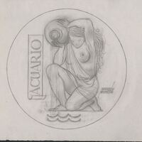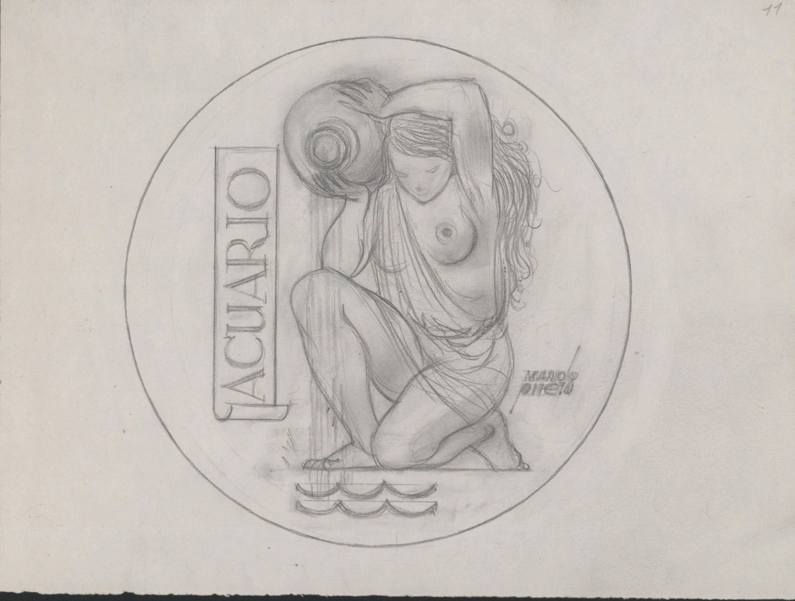 Delicado boceto a lápiz del anverso de la medalla que representa el signo del zodiaco Acuario, con la figura de una mujer cuya pierna está apoyada sobre el suelo y la otra levantada que vierte agua del cántaro que apoya sobre su hombro izquierdo sujeto con sus manos.Dibujo para la realización de la medalla ACUARIO (anverso) encargada por INSTITUTO NUMISMÁTICO. ME/G/1415 ME/ otros archivos: NO?