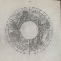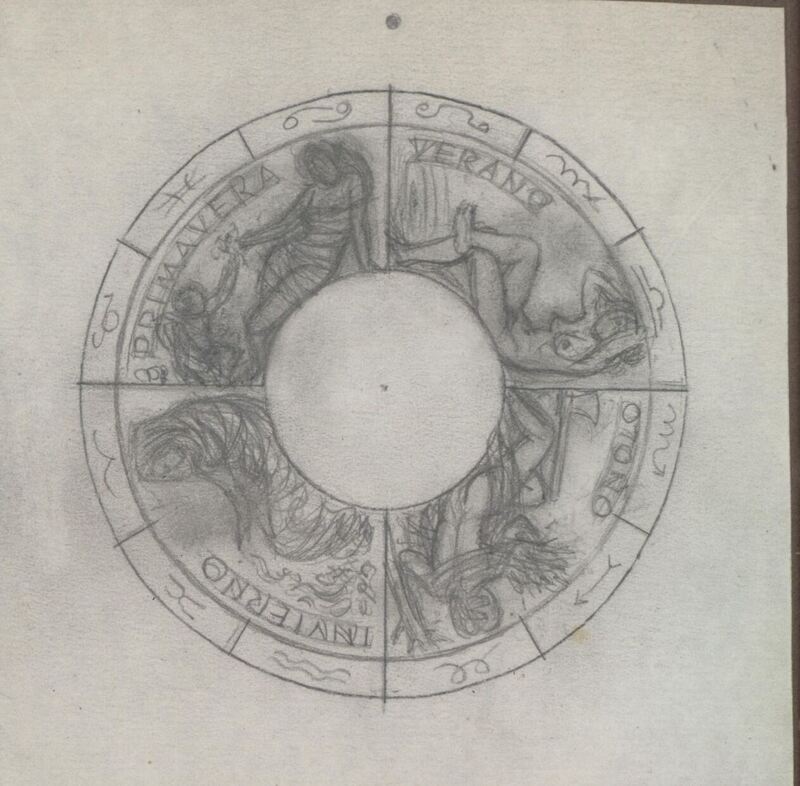 Boceto a lápiz de una de las caras de una medalla que representa las cuatro estaciones del año, aquí el autor no especifica si corresponde al reverso o anverso de la medalla, divida en secciones alrededor de un círculo central en blanco y alrededor de toda la composición se aprecia un perfil donde se representa los iconos de cada signo del zodiaco.bocetosobre signos del zodiaco que no llegó a ser realizado. ME/Dib 321+323+324+326 Otros archivos: NO