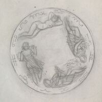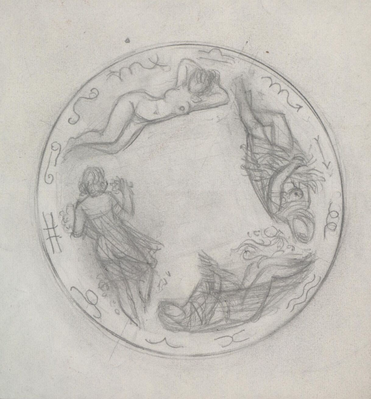 Boceto a lápiz de una de las caras de una medalla que representa las cuatro estaciones del año, aquí el autor no especifica si corresponde al reverso o anverso de la medalla, con la imagen compuesto por cuatro figuras femeninas desnudas tumbadas dispuestas en torno a la superficie de la medalla junto a los iconos correspondientes a cada signo del zodiaco.Boceto estudio reverso signos del zodiaco que no llegó a realizarse. Encargo de Instituto Numismático. Otros archivos: ME/Bo/322+323+326. ME/Dib/.321