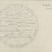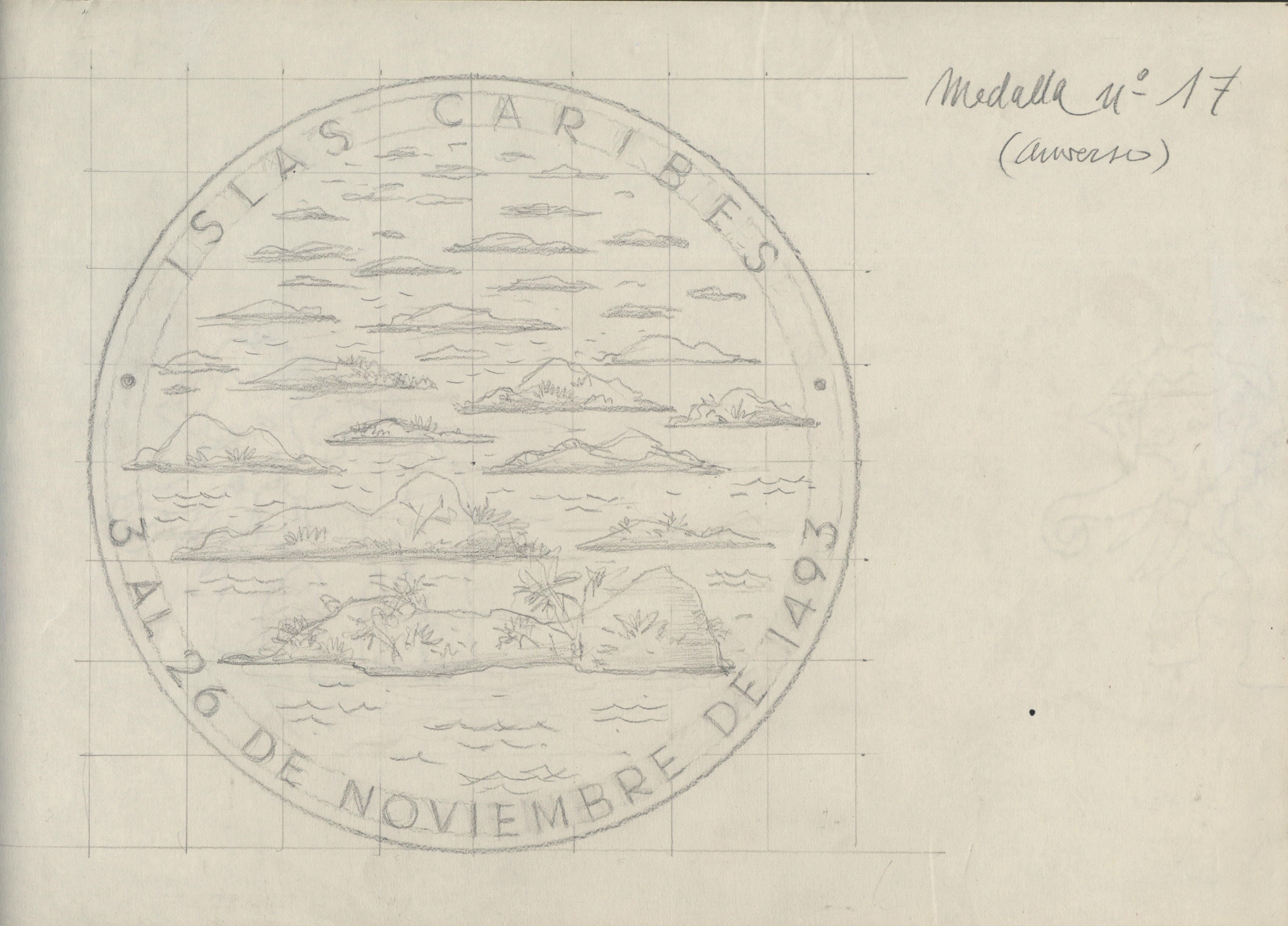 Boceto a lápiz del anverso de la medalla número diecisiete, donde ocupando todo en el campo de la superficie se aprecia un conjunto de islas en el océano, junto a las letras “Islas Caribes, 3 al 26 de Noviembre de 1493.”Para Numismática Ïberica serie V centenario… …. Otros Archivos: MBO/409+465 MBR/1358