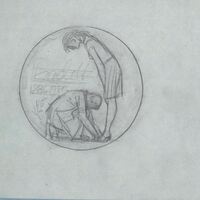 - Boceto a lápiz de una de las caras de una medalla donde se aprecia la escena de una mujer de perfil un poco inclinada ante un caballero que le está tomando medidas de sus zapatos.Boceto sobre una medalla parece al zapato. Sin referencias