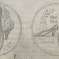 - Boceto a lápiz de las caras de una medalla donde se aprecia los dibujos de un juego de zapatos junto a unas ramas de laurel y unas fechas conmemorativas de la que es la tienda que solicita la medalla.Boceto sobre estudio al zapato para conmemorar su centenario?. Sin referencias