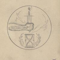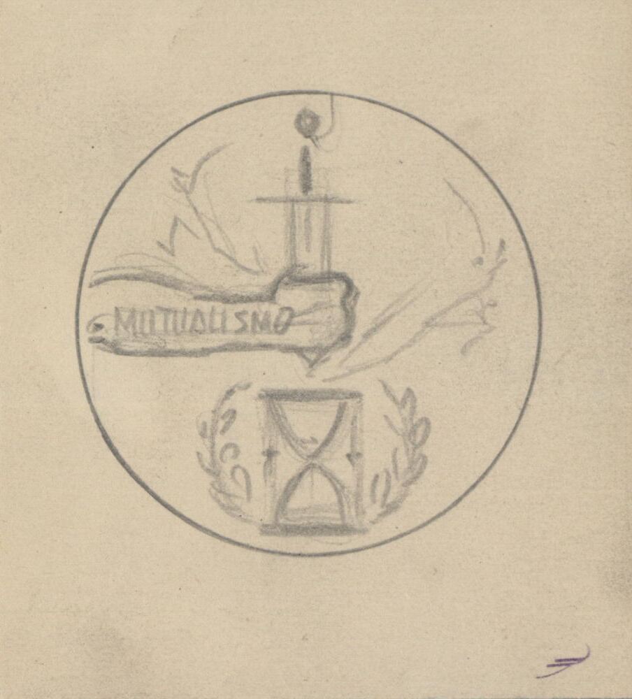 - Primer boceto de una medalla titulada como Mutualismos, donde se ve el brazo de un hombre que sujeta un cuchillo que se dispone a romper un reloj de arena, que simboliza tradicionalmente al tiempo.Para la Casa de la Moneda, una medall sobre el Mutualismo, este boceto no fue realizasdo.