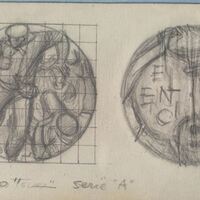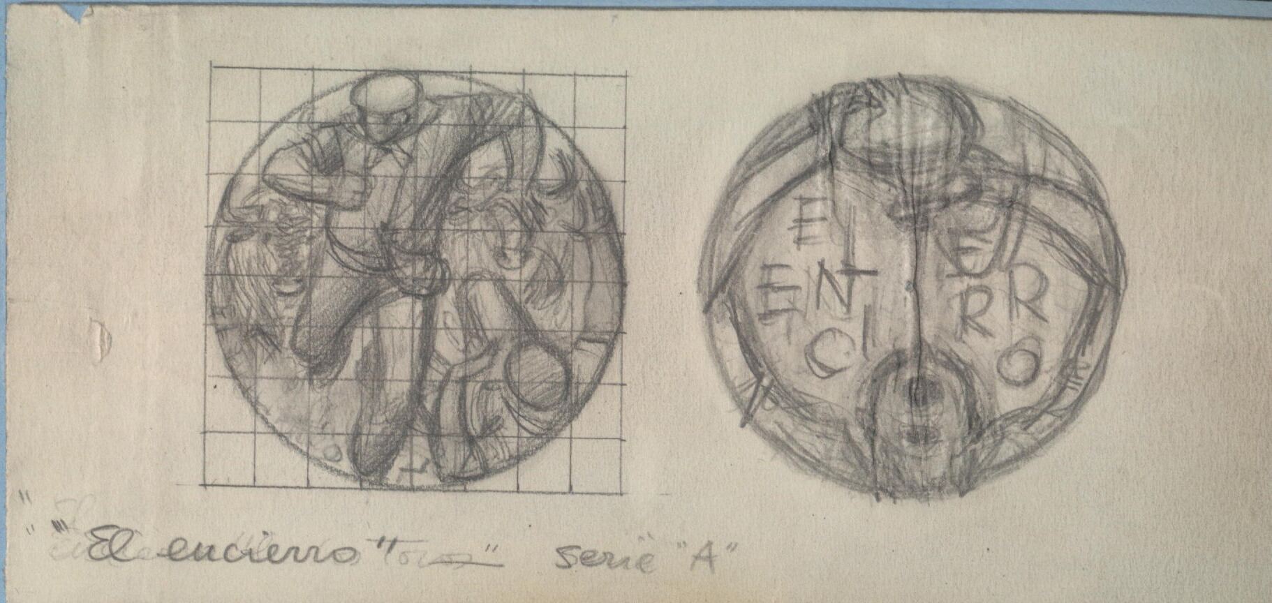 - Boceto a lápiz de las caras de la medalla titulada El encierro, en el anverso la escena de unos mozos corriendo ante el toro en un encierro junto al reverso donde se aprecia en primer término la cabeza de un hombre inclinada bebiendo de una bota de vino.Para la casa de la moneda, Serie A Tauromaquia. Otros archivos: MBR/1392 MEP/ 1680