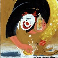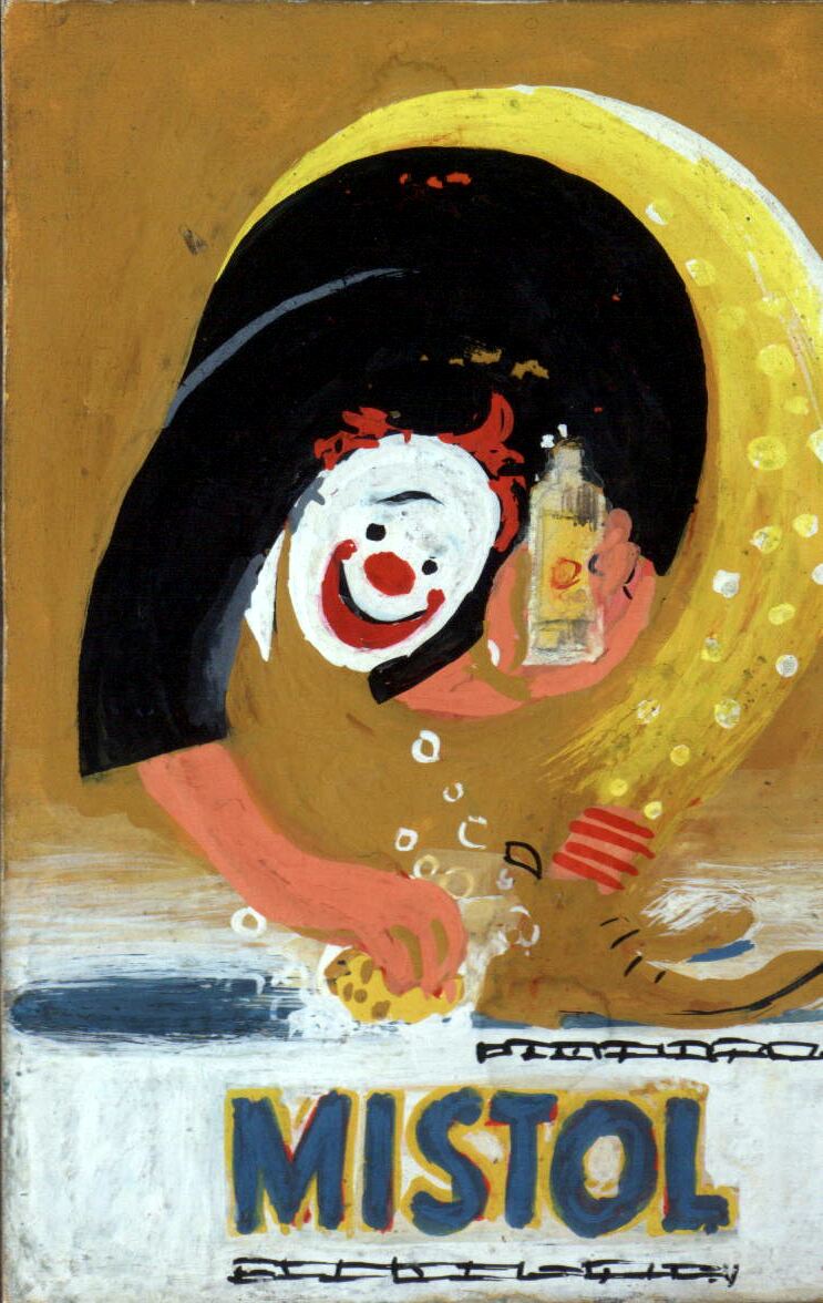 - Imagen de la figura de un payaso contorsionista, donde destaca su cara blanca de gran sonrisa roja sobre un cuerpo negro, un pantalón amarillo de lunares claros y sus zapatos grandes con calcetines a rayas, en su mano una esponja de donde sale unas burbujas y debajo de la imagen descrita se puede leer la palabra Mistol en tonos azules.