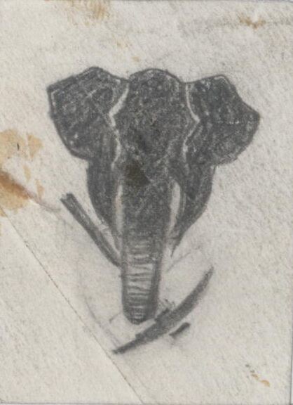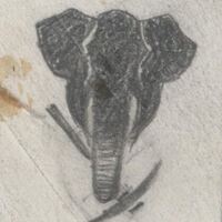 - Cabeza de elefante en primer término, trasladando con su trompa una herramienta de un pico. Quizá la elección del elefante se haya escogido por su fuerza, tenacidad y obediencia, virtudes todas relacionadas con la construcción.