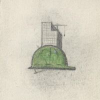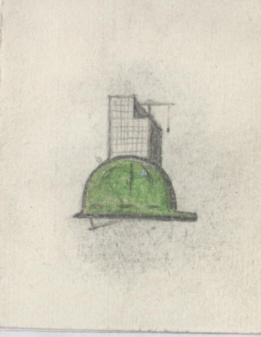 - Boceto que con sólo tres imágenes, nos desvela la temática de la composición mediante la superposición de los elementos, en primer término un casco verde de obrero, detrás de él un edificio a lápiz y al fondo la silueta de una grúa.