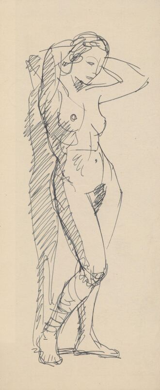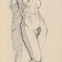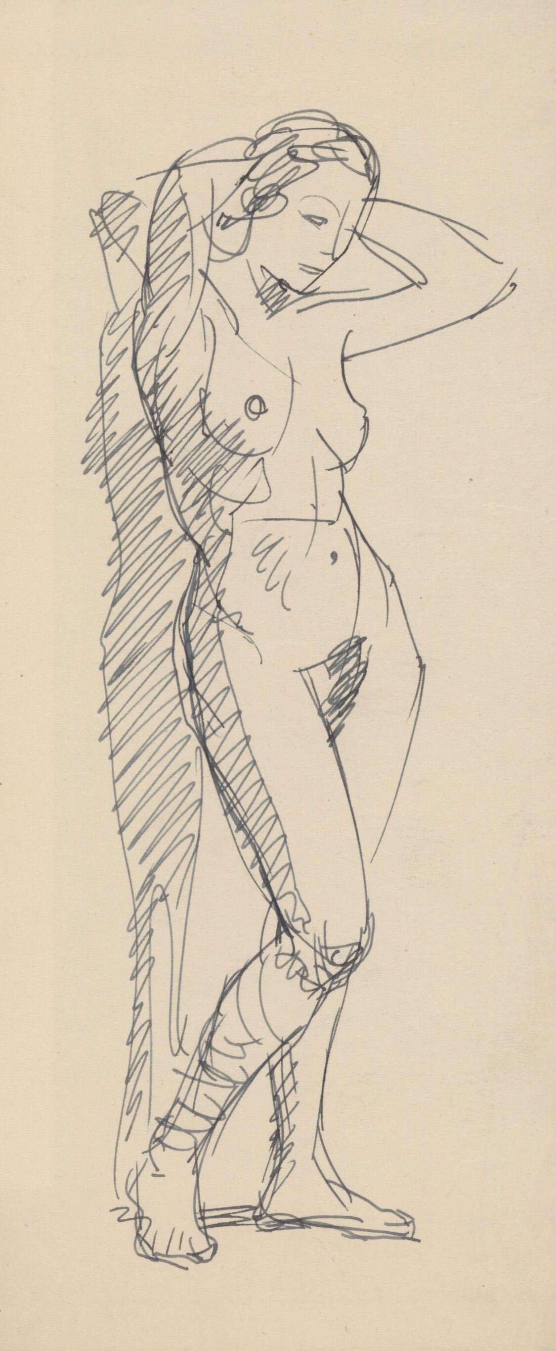 - Precioso apunte del desnudo de una mujer de frente al espectador, con los brazos apoyados en la cabeza perfilando las sombras con rayas paralelas. El movimiento de la figura está perfectamente conseguido con unas poquísimas líneas de contorno.