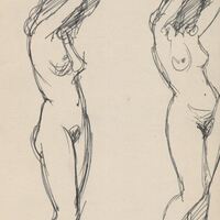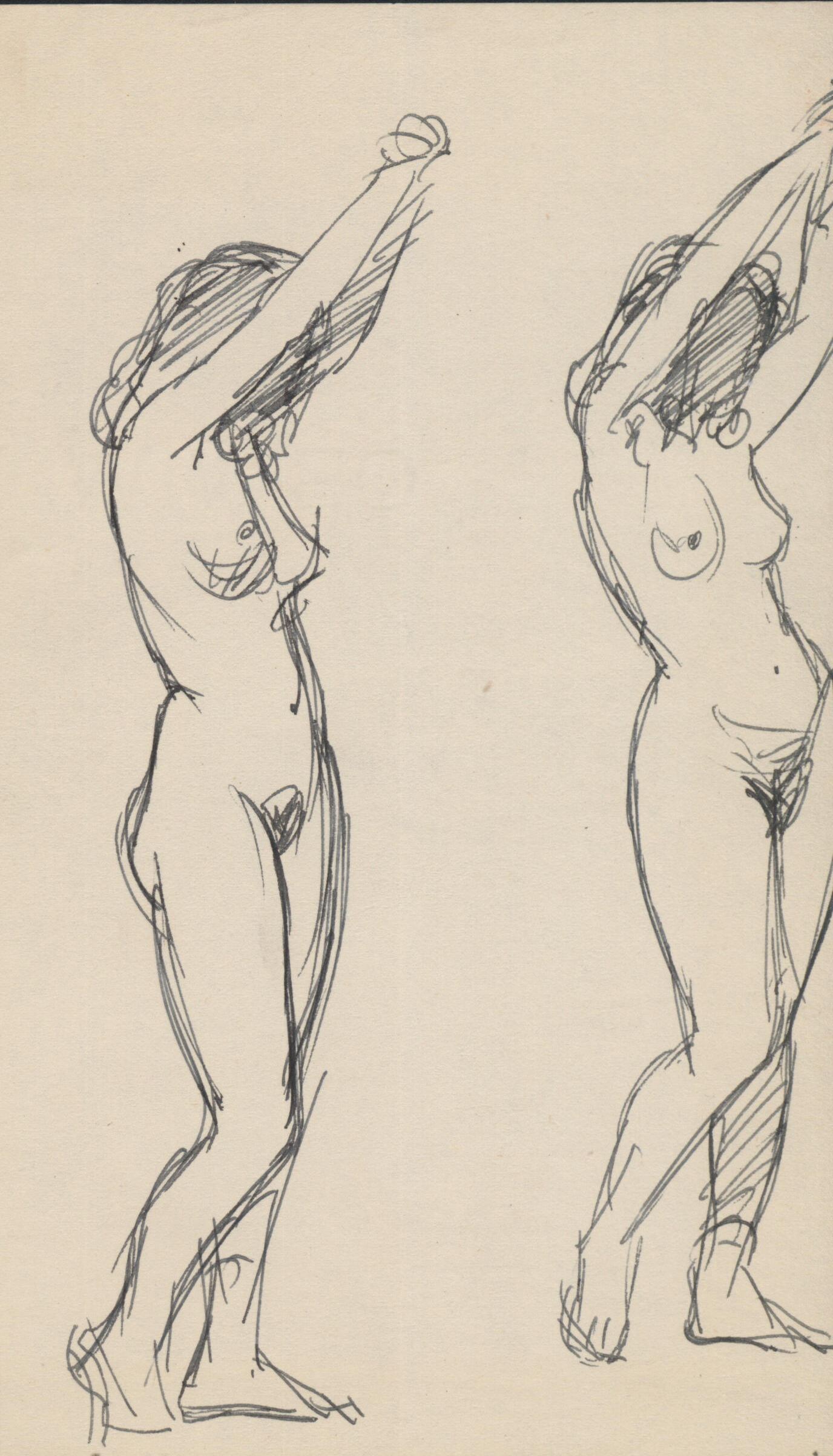 - Apunte del desnudo de una mujer con los brazos extendidos por encima de su cabeza en aptitud de estiramiento. Como en otros casos, son posturas realizadas en un estudio de dibujo por una modelo.