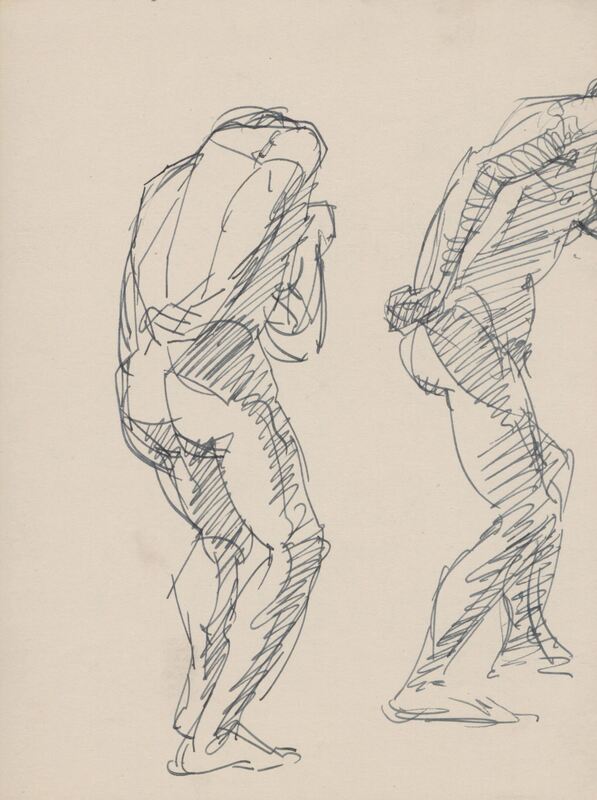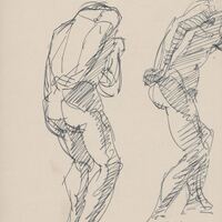 - Apunte donde en un primer término se aprecia la figura de un hombre desnudo de espaldas, cargando un objeto de gran peso y en un segundo plano el mismo personaje en una postura diferente visto de perfil.