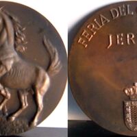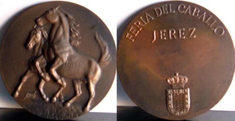 - Fotografía de las caras de una medalla representativa de la Feria del caballo de Jerez, con la imagen de unos caballos, en primer término uno de ellos con las patas delanteras levantadas junto al reverso donde se lee la leyenda y el escudo correspondiente.