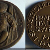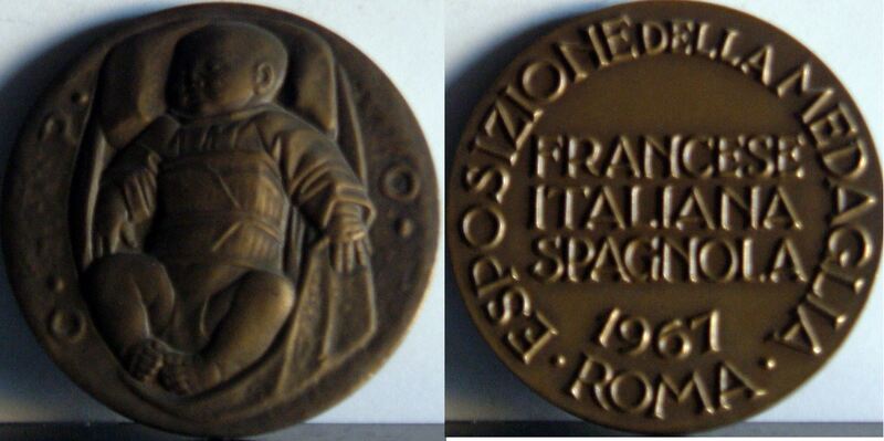 - Fotografía de las caras de una medalla conmemorativa de la Exposición de Medallas celebrada en Italia, Francia y España, cuya leyenda aparece inscrita en el reverso, junto a la imagen de un recién nacido tumbado en una trona.