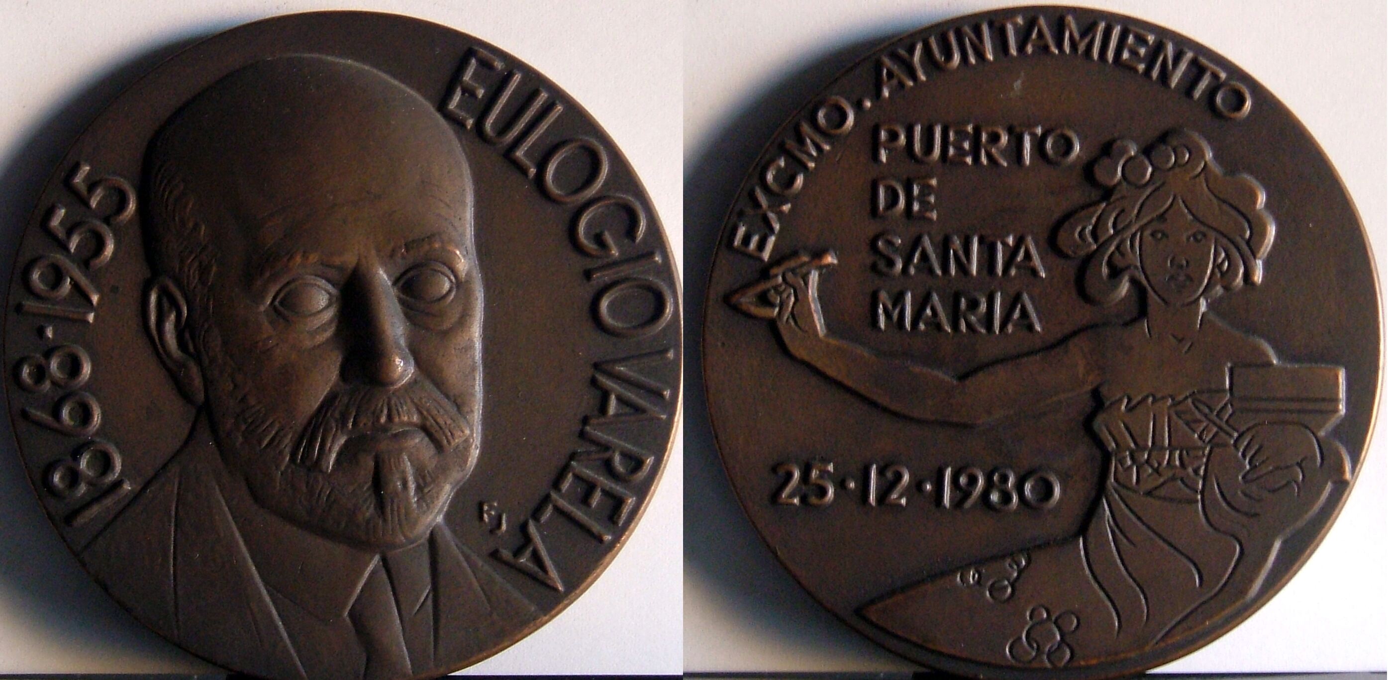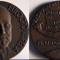 - Fotografía de las caras de una medalla conmemorativa, donde en el anverso se aprecia el retrato de Eulogio Valera junto al reverso donde se aprecia la figura de una mujer de frente apoyada sobre el respaldo de una silla con las letras del Excelentísimo Ayuntamiento Puerto de Santa María.