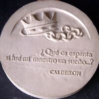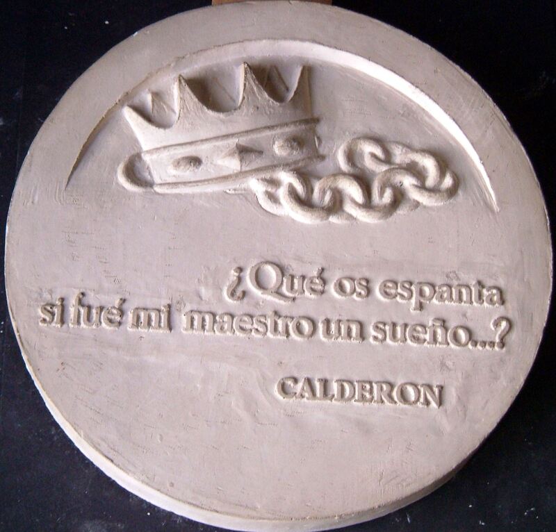 - Molde en positivo de escayola de una medalla donde se aprecia la figura de una corona junto a una cadena y un párrafo de la obra de “La vida es sueño” de Calderón de la Barca.