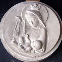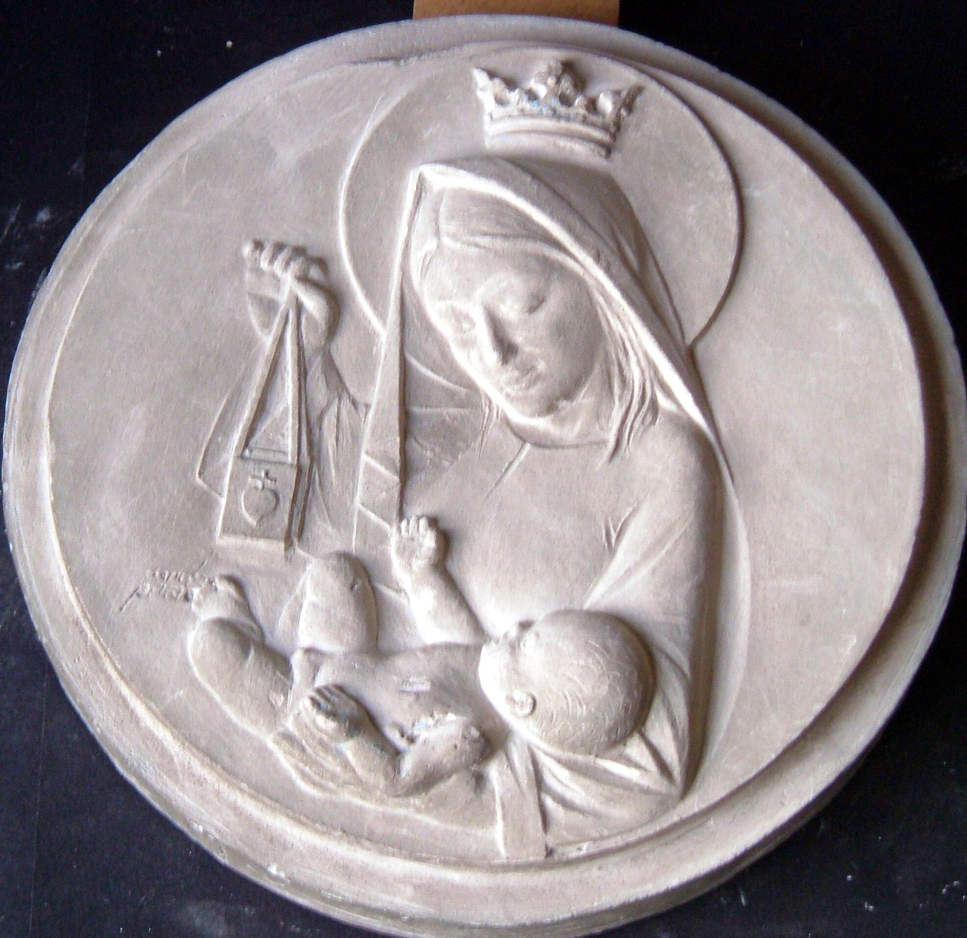 - Molde en positivo de escayola de una medalla donde se aprecia la figura de la Virgen María con el Niño Jesús en brazos enseñándole un escapulario del Sagrado Corazón con la mano.