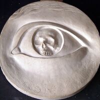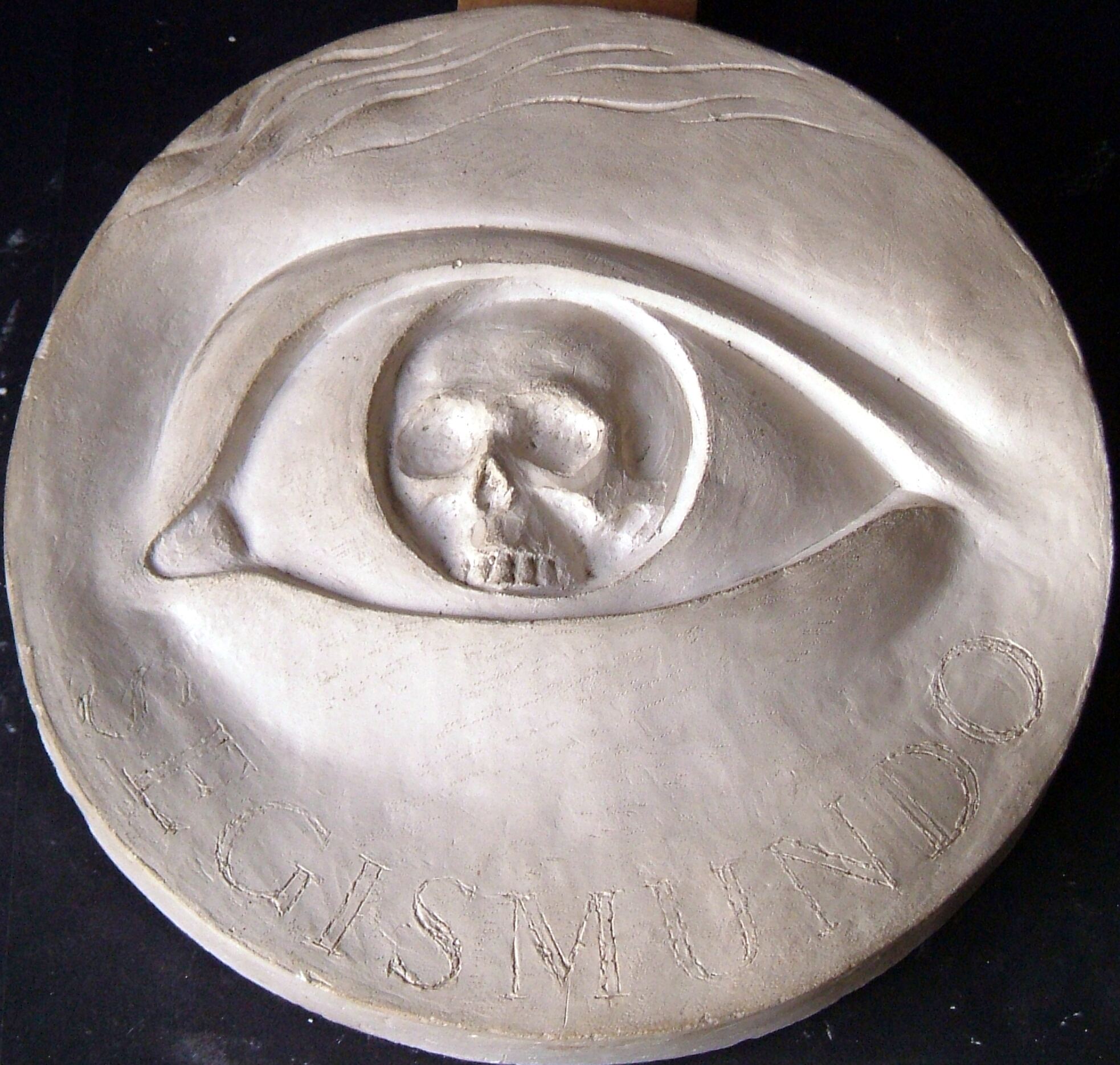 - Molde de escayola de la cara de una medalla donde se aprecia la impresionante imagen de un gran ojo en cuya pupila se perfila una calavera, y que pertenece a la imagen medallística de “Segismundo”.