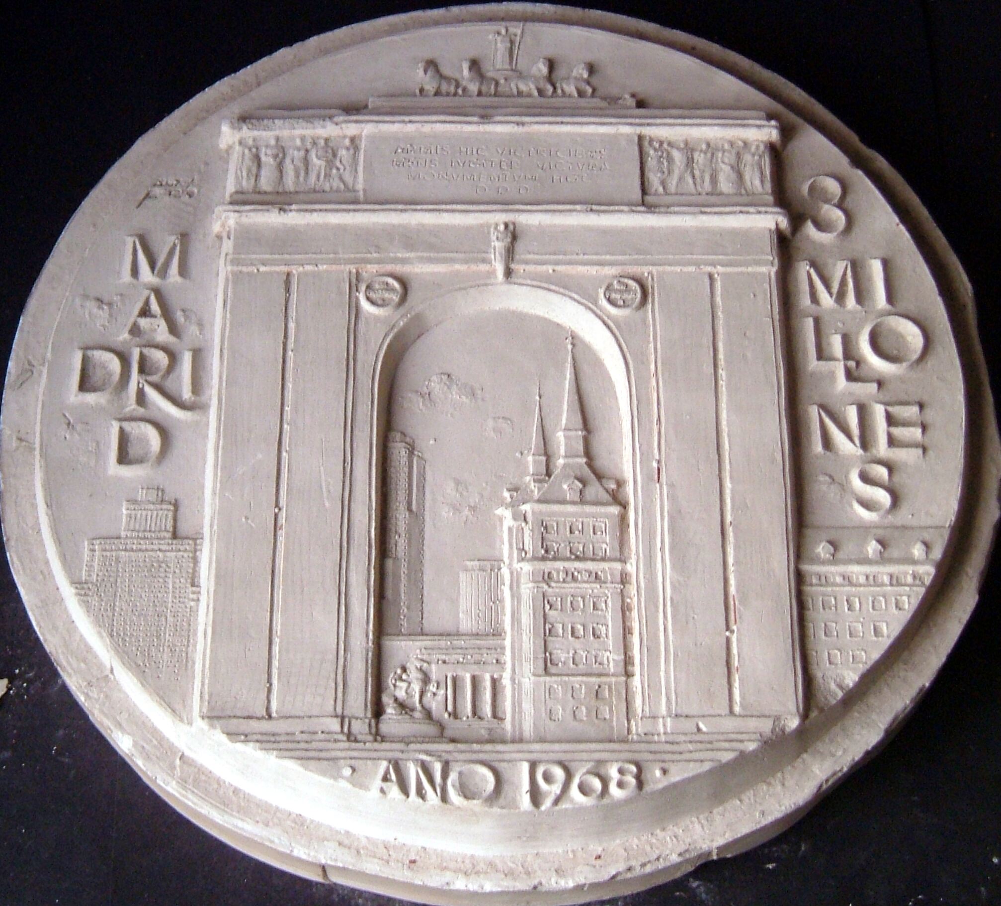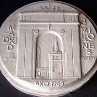 - Molde de escayola de la cara de una medalla donde se aprecia el monumento madrileño del Arco de Triunfo junto a la siluetas de edificios significativos de la ciudad y las letras que dicen “Madrid tres millones”.