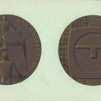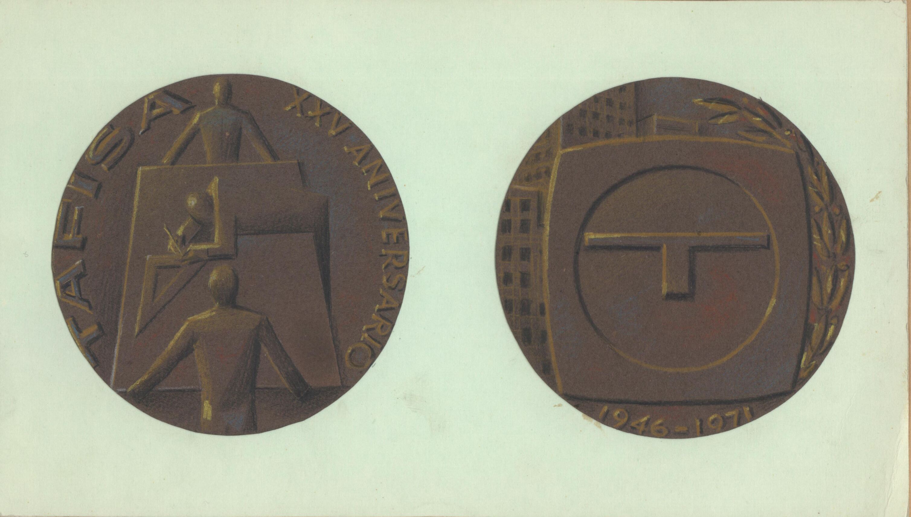 - Dibujo de las dos caras de una medalla conmemorativa en el aniversario de Tafisa, en el anverso la imagen central de una gran mesa de trabajo donde un hombre dibuja ayudado por una escuadra y ambos lados dos hombres sujetando el tablero, a su lado el reverso donde se representa la letra T inscrita en una circunferencia sobre un cuadrado.Sin referencias no llegó a realizarse?