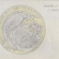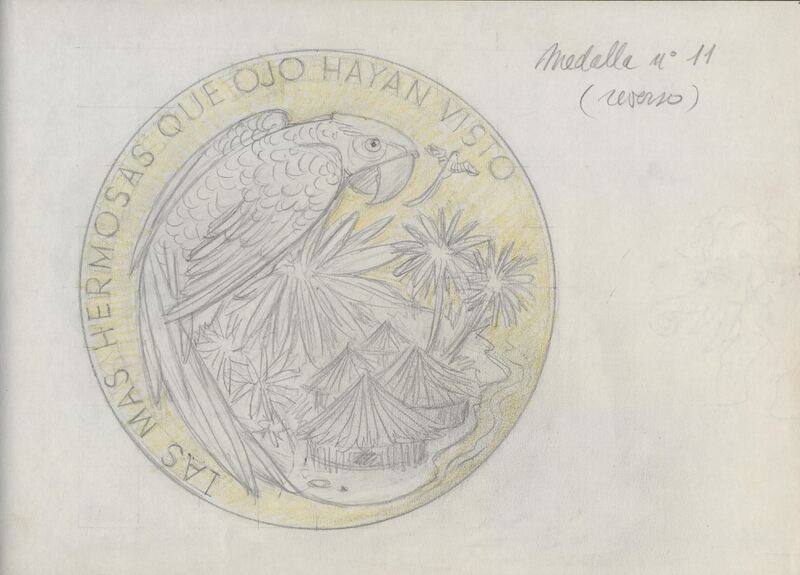 Boceto a lápiz sobre fondo de color amarillo pálido, del reverso de la medalla número once, donde en primer término se aprecia a un pájaro exótico sobre una rama y debajo un grupo de chozas y palmeras pertenecientes a un poblado indígena junto a las letras ”las más hermosas que ojo hayan visto.”realizada para Numismática Iberica serie V Centenario…( reverso) OTROS ARCHIVOS: MBR/1345 (anv/rev.) MBO/402+451