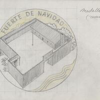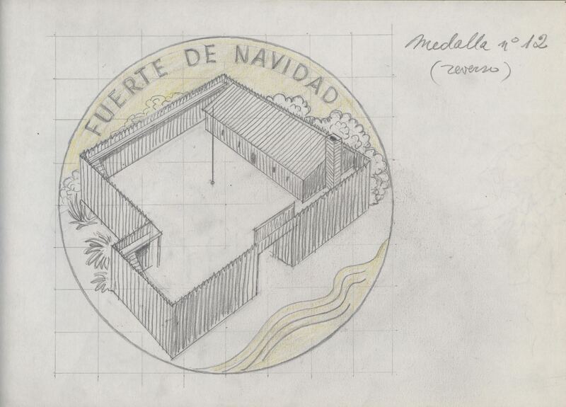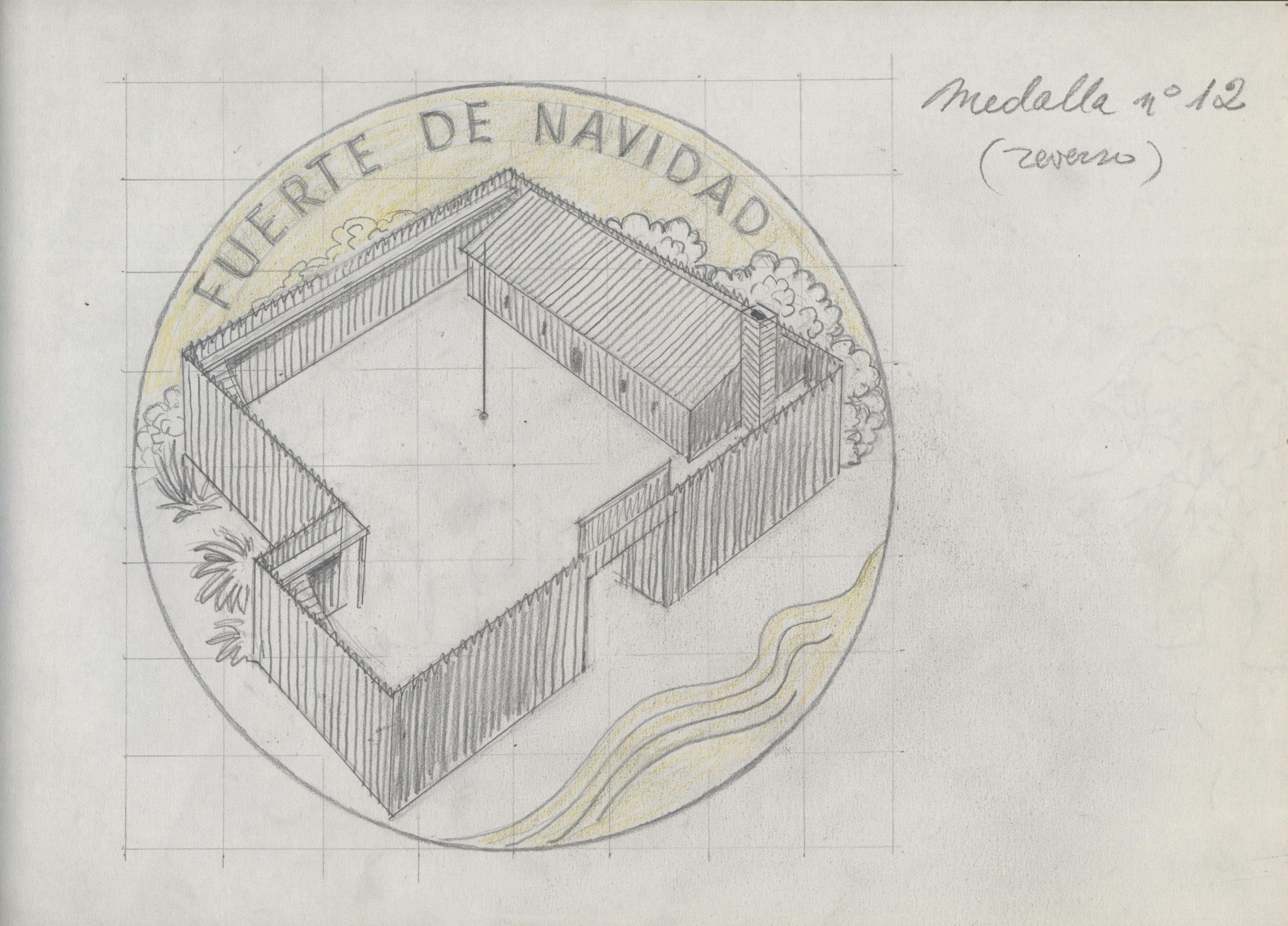 Boceto a lápiz sobre un fondo de color amarillo pálido, del reverso de la medalla número doce Fuerte de Navidad donde se aprecie la estructura de madera del fuerte y su interior, donde se encuentra un barracón alargado que ocupa el ancho del fuerte.realizada para Numismática Iberica serie del V Centenario OTROS ARCHIVOS. MBO/405+419+453 MBR/1340…