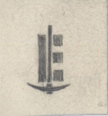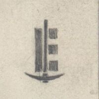 - Dibujo de la letra E que ocupa el centro del espacio, y un pico de trabajo superpuesto paralelamente a la letra, lo que hace una composición de constructivismo muy sugerente.