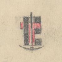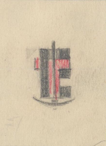 - Al igual que en su primer boceto, se observa un dibujo de la letra E que ocupa el centro del espacio, y la “T” en rojo entrelazada con ella. El pico de trabajo superpuesto, paralelamente a las letras.