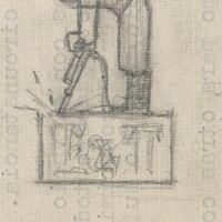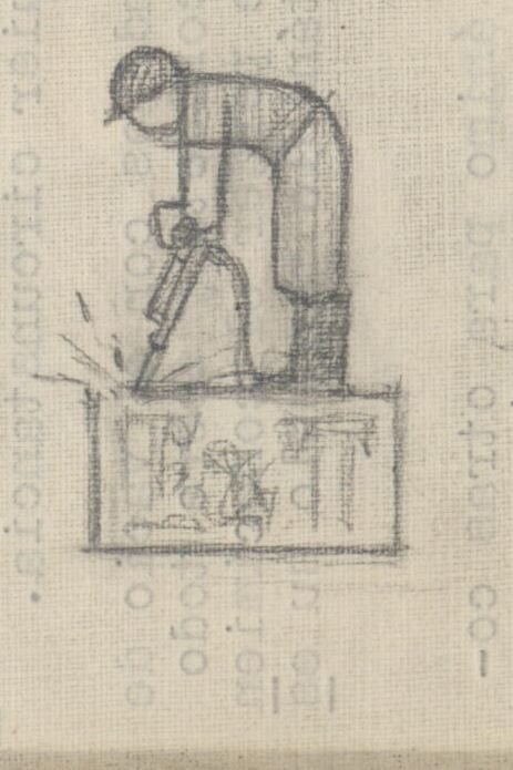 - La simpática figura de un operario trabajando sobre un bloque de piedra donde se encuentran delineadas dos letras “E” y “T”. El esquematismo del personaje tiene un elemento simbólico.