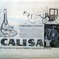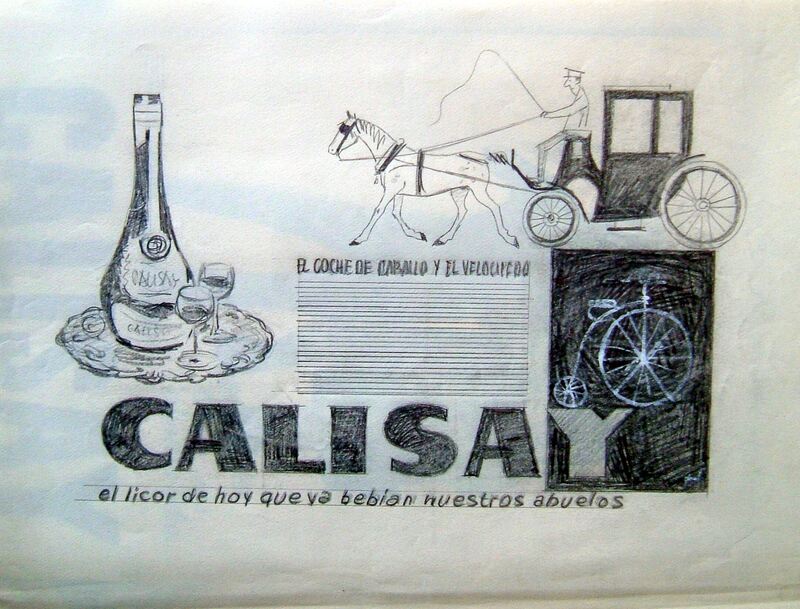 - Boceto a lápiz de un cartel de Calisay, en primer lugar en la parte superior del cartel el dibujo de un caballo tirando de un carruaje conducido por un cochero, debajo la imagen de una botella del licor anunciado junto al boceto de la leyenda y el rótulo del cartel.