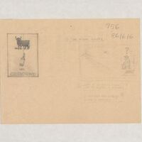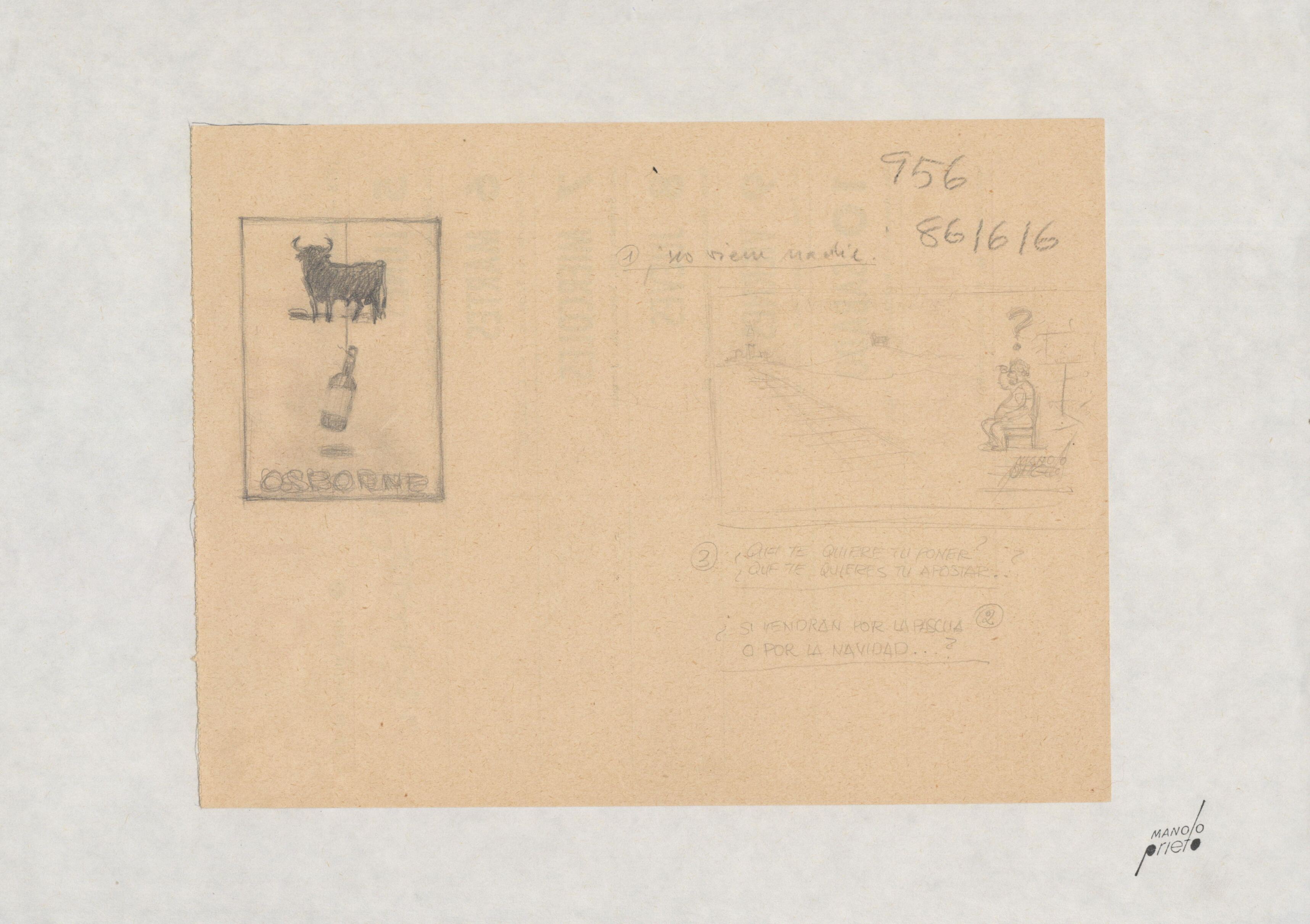 - Boceto a lápiz de un cartel publicitario para las bodegas Osborne, donde en la esquina superior se puede apreciar la silueta enmarcada de un toro y en primer término una botella colgada de una cuerda, al lado apuntes escritos a lápiz con el boceto de otro dibujo y una serie de anotaciones.