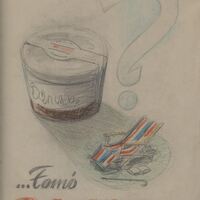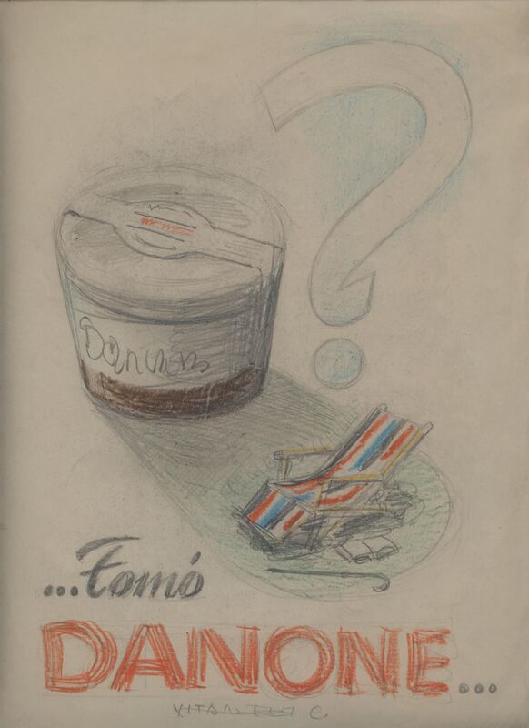 - Boceto de un posible cartel de Danone, donde aparece un gran yogurt en cuya sombra hay una hamaca de rayas de colores con un libro y un bastón y entre medias un signo de interrogación grande, debajo de la composición se puede leer”…tomó Danone….”