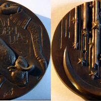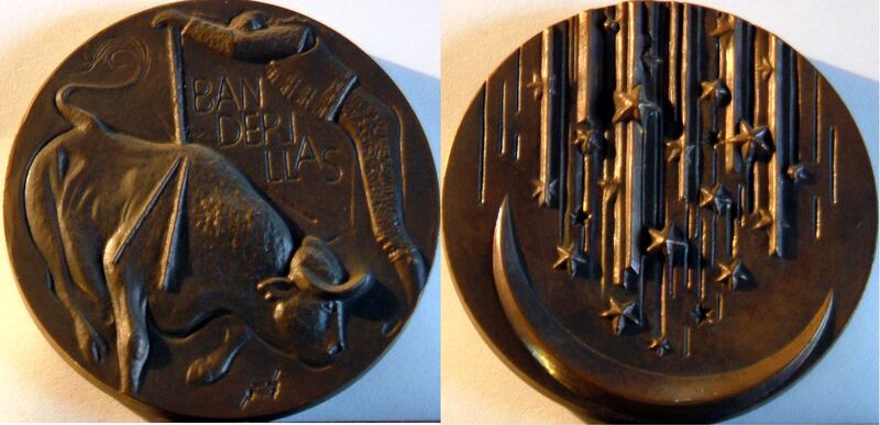 - Fotografía de las caras de una medalla de bronce titulada Banderillas, donde se aprecian los bajorrelieves de la escena en la que un banderillero clava las banderillas al toro junto a la imagen de una media luna regada por una lluvia de estrellas.