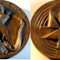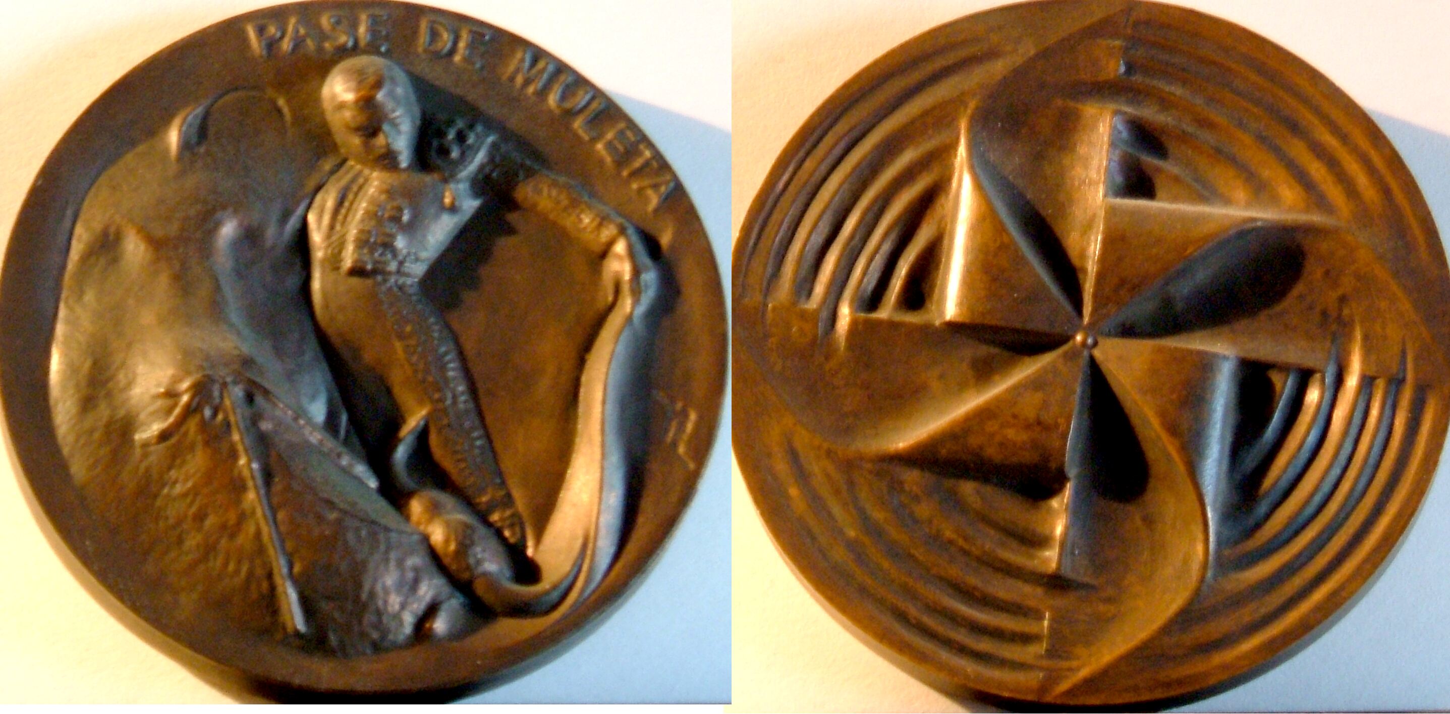 - Fotografía de las caras de una medalla de bronce titulada Pase de muleta, donde se aprecian los bajorrelieves de un torero con un pase de muleta al toro y a la imagen de un molino de viento sobre un fondo de rayas circulares.