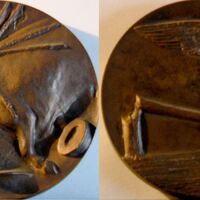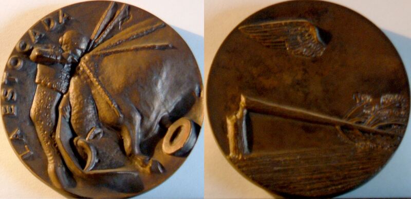 - Fotografía de las caras de una medalla de bronce titulada La estocada, donde se aprecian los bajorrelieves de un torero en el momento de la estocada final al toro y la imagen del tronco de un árbol derribado sobre un campo arado de cuyo cielo sobresale media ala.